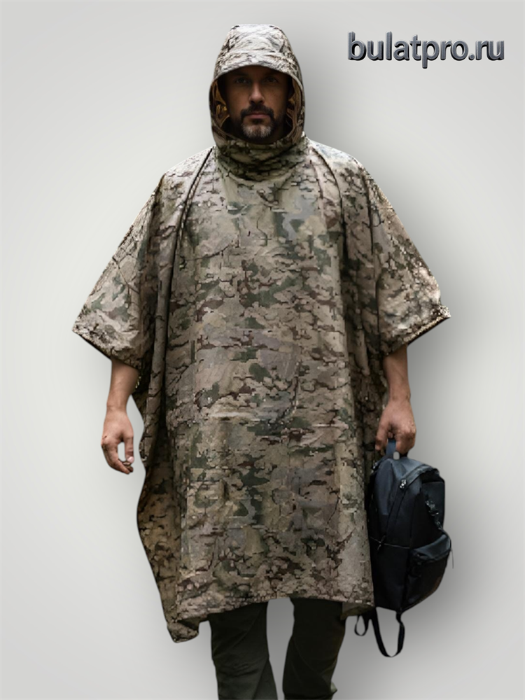 Ткань (Таффета 210T RipStop с водостойким покрытием PU) 10 000 мм (держит сильный дождь) _______________________ ОПИСАНИЕ Прямоугольник размером 200*145 см Плащ дождевик (пончо) необходимая вещь для военнослужащих, рыбаков, охотников и любителям походов. Имеет высокую прочность благодаря применению технологии Rip-Stop, а так же обеспечивает высокую степень защиты от дождя и ветра, все швы проклеены, а большое кол-во утяжек делает ношение еще более комфортным! ОСОБЕННОСТИ ДОЖДЕВИКА 1) Можно использовать как палатку (имеются люверсы), как непромокаемый чехол для мешка, изоляция от земли. 2) Свободный крой позволяет легко одевать поверх одежды и не сковывает движения. 3) Имеет пресс-шпильки, которые позволяют сделать рукава или соединить вместе два дождевика. 4) Полностью водонепроницаемый и быстросохнущий (надежно защищает от дождя и ветра). 5) Высокая прочность, благодаря применению технологии Rip-Stop. 6) Все швы проклеены. 7) Большое количество утяжек (для подгонки под свой размер). 8) Капюшон со шнуровкой, обеспечивает отличную защиту, даже при сильном ветре, с проливным дождем. ХАРАКТЕРИСТИКИ • Прочный материал Ripstop, ПЭ 100% • Длина по спинке: 150 см • Легкий вес и компактные размеры в сложенном виде: 14х22 см • Размер: универсальный • Страна производства: Россия • Комплект: Чехол + Дождевик