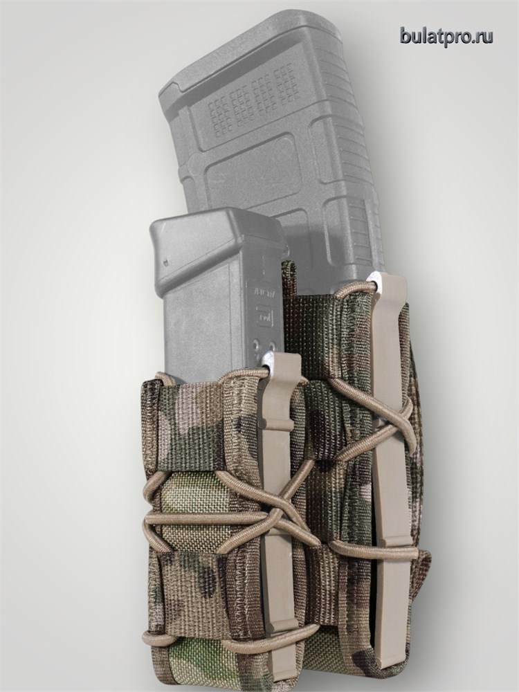 Изделие выполнено из высокопрочной ткани, плотностью 1000D, оснащено стропами для монтажа к снаряжению по системе MOLLE. Имеет пластиковый каркас, который плотно удерживает магазины и вместе с тем, гарантирует его быстрое извлечение.