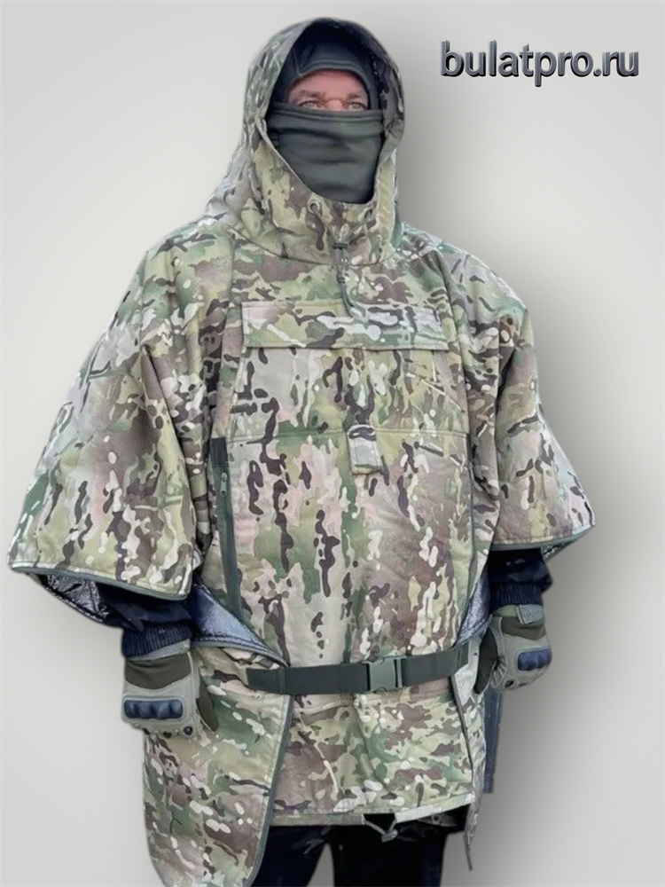 — Пончо-спальник имеет капюшон с козырьком, который оснащен стягивающим шнуром по контуру лица и на затылке